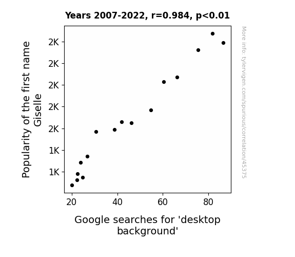 This means 96.8% of the change in the one variable (i.e., Google searches for 'desktop background') is predictable based on the change in the other (i.e., Popularity of the first name Giselle) over the 16 years from 2007 through 2022.