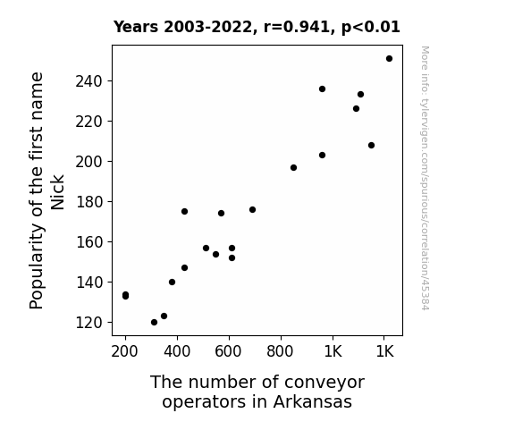 This means 88.5% of the change in the one variable (i.e., The number of conveyor operators in Arkansas) is predictable based on the change in the other (i.e., Popularity of the first name Nick) over the 20 years from 2003 through 2022.