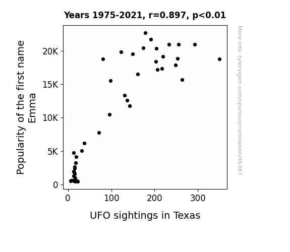 This means 80.5% of the change in the one variable (i.e., UFO sightings in Texas) is predictable based on the change in the other (i.e., Popularity of the first name Emma) over the 47 years from 1975 through 2021.