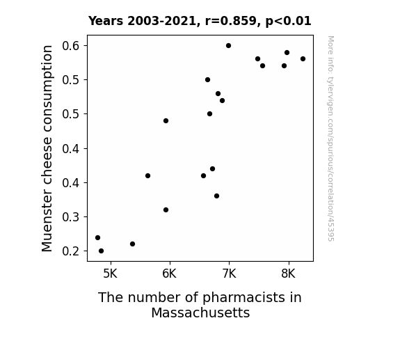 This means 73.8% of the change in the one variable (i.e., The number of pharmacists in Massachusetts) is predictable based on the change in the other (i.e., Muenster cheese consumption) over the 19 years from 2003 through 2021.