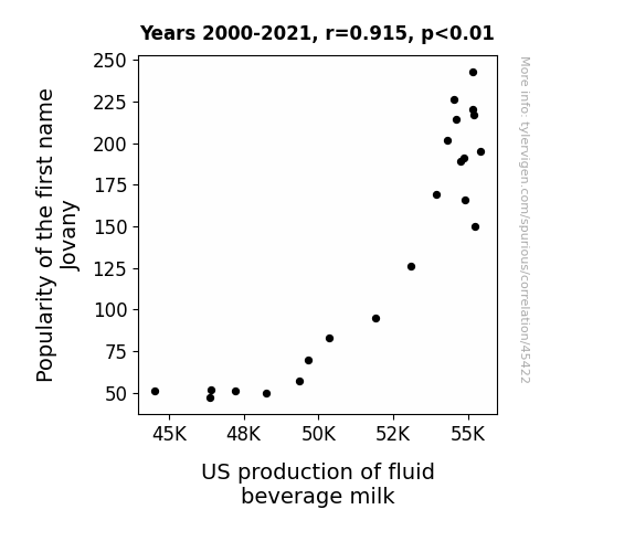 This means 83.6% of the change in the one variable (i.e., US production of fluid beverage milk) is predictable based on the change in the other (i.e., Popularity of the first name Jovany) over the 22 years from 2000 through 2021.