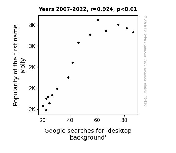 This means 85.4% of the change in the one variable (i.e., Google searches for 'desktop background') is predictable based on the change in the other (i.e., Popularity of the first name Molly) over the 16 years from 2007 through 2022.