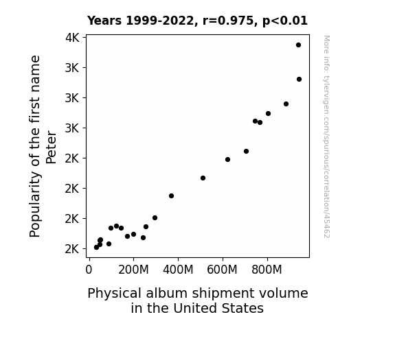 This means 95.1% of the change in the one variable (i.e., Physical album shipment volume in the United States) is predictable based on the change in the other (i.e., Popularity of the first name Peter) over the 24 years from 1999 through 2022.