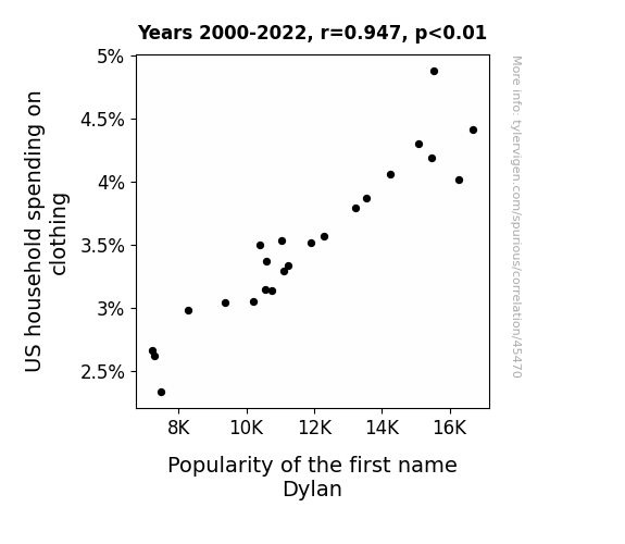 This means 89.6% of the change in the one variable (i.e., Popularity of the first name Dylan) is predictable based on the change in the other (i.e., US household spending on clothing) over the 23 years from 2000 through 2022.