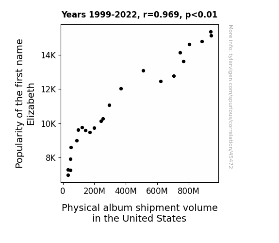 This means 93.9% of the change in the one variable (i.e., Physical album shipment volume in the United States) is predictable based on the change in the other (i.e., Popularity of the first name Elizabeth) over the 24 years from 1999 through 2022.