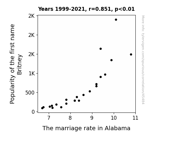 This means 72.4% of the change in the one variable (i.e., The marriage rate in Alabama) is predictable based on the change in the other (i.e., Popularity of the first name Britney) over the 23 years from 1999 through 2021.