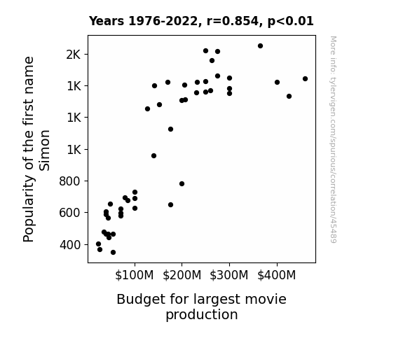This means 72.9% of the change in the one variable (i.e., Budget for largest movie production) is predictable based on the change in the other (i.e., Popularity of the first name Simon) over the 47 years from 1976 through 2022.