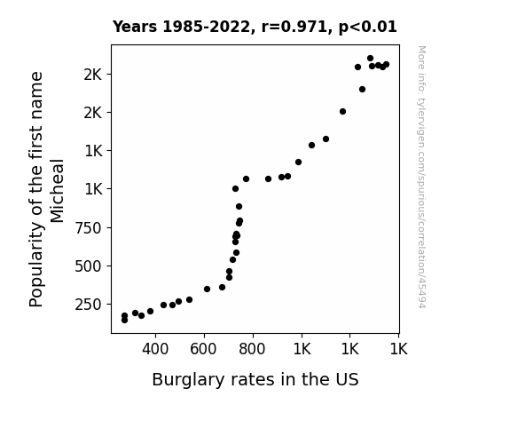 This means 94.2% of the change in the one variable (i.e., Burglary rates in the US) is predictable based on the change in the other (i.e., Popularity of the first name Micheal) over the 38 years from 1985 through 2022.