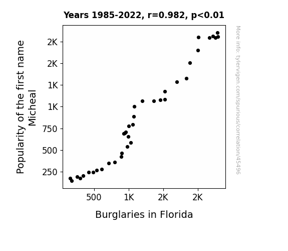 This means 96.4% of the change in the one variable (i.e., Burglaries in Florida) is predictable based on the change in the other (i.e., Popularity of the first name Micheal) over the 38 years from 1985 through 2022.