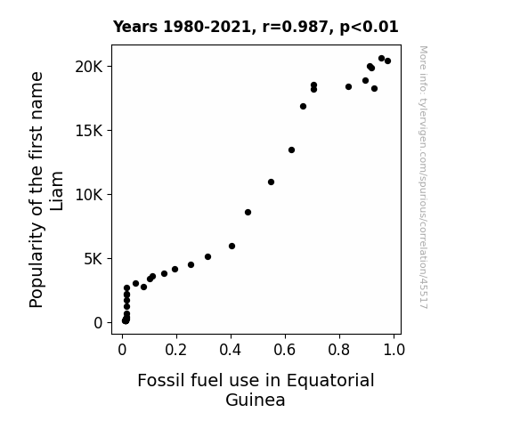 This means 97.4% of the change in the one variable (i.e., Fossil fuel use in Equatorial Guinea) is predictable based on the change in the other (i.e., Popularity of the first name Liam) over the 42 years from 1980 through 2021.