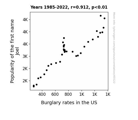This means 83.2% of the change in the one variable (i.e., Burglary rates in the US) is predictable based on the change in the other (i.e., Popularity of the first name Joel) over the 38 years from 1985 through 2022.