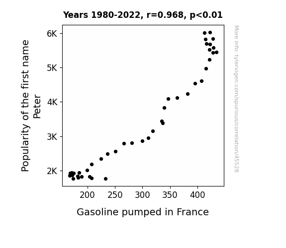 This means 93.7% of the change in the one variable (i.e., Gasoline pumped in France) is predictable based on the change in the other (i.e., Popularity of the first name Peter) over the 43 years from 1980 through 2022.