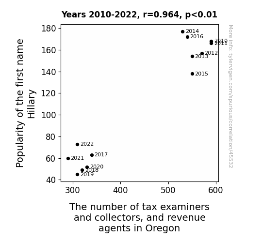 This means 93% of the change in the one variable (i.e., The number of tax examiners and collectors, and revenue agents in Oregon) is predictable based on the change in the other (i.e., Popularity of the first name Hillary) over the 13 years from 2010 through 2022.