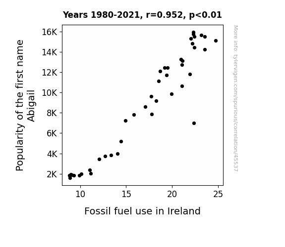 This means 90.7% of the change in the one variable (i.e., Fossil fuel use in Ireland) is predictable based on the change in the other (i.e., Popularity of the first name Abigail) over the 42 years from 1980 through 2021.