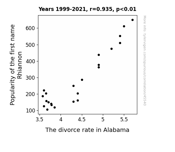 This means 87.4% of the change in the one variable (i.e., The divorce rate in Alabama) is predictable based on the change in the other (i.e., Popularity of the first name Rhiannon) over the 23 years from 1999 through 2021.