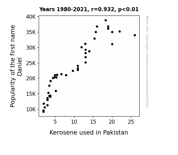 This means 86.9% of the change in the one variable (i.e., Kerosene used in Pakistan) is predictable based on the change in the other (i.e., Popularity of the first name Daniel) over the 42 years from 1980 through 2021.