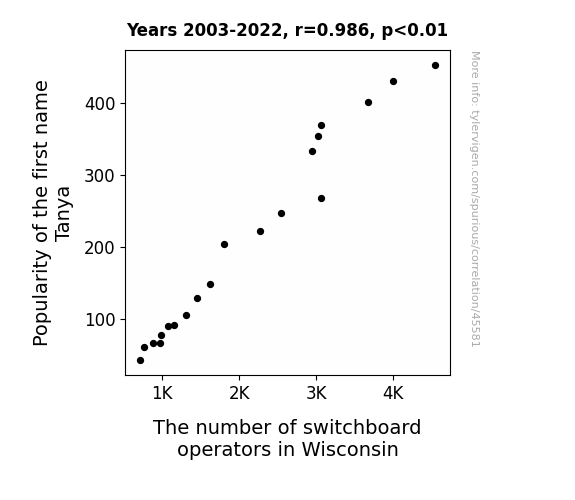 This means 97.1% of the change in the one variable (i.e., The number of switchboard operators in Wisconsin) is predictable based on the change in the other (i.e., Popularity of the first name Tanya) over the 20 years from 2003 through 2022.
