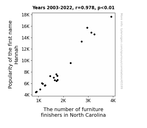 This means 95.6% of the change in the one variable (i.e., The number of furniture finishers in North Carolina) is predictable based on the change in the other (i.e., Popularity of the first name Hannah) over the 20 years from 2003 through 2022.