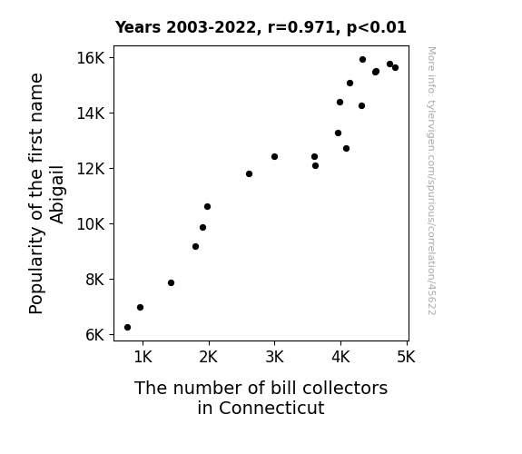 This means 94.3% of the change in the one variable (i.e., The number of bill collectors in Connecticut) is predictable based on the change in the other (i.e., Popularity of the first name Abigail) over the 20 years from 2003 through 2022.