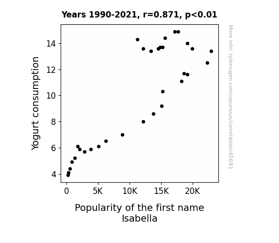This means 75.8% of the change in the one variable (i.e., Popularity of the first name Isabella) is predictable based on the change in the other (i.e., Yogurt consumption) over the 32 years from 1990 through 2021.