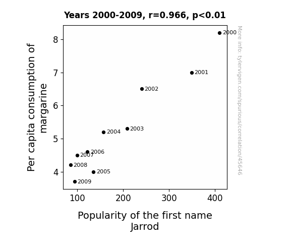 This means 93.3% of the change in the one variable (i.e., Popularity of the first name Jarrod) is predictable based on the change in the other (i.e., Per capita consumption of margarine) over the 10 years from 2000 through 2009.