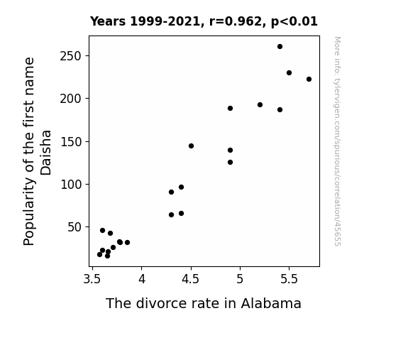 This means 92.6% of the change in the one variable (i.e., The divorce rate in Alabama) is predictable based on the change in the other (i.e., Popularity of the first name Daisha) over the 23 years from 1999 through 2021.
