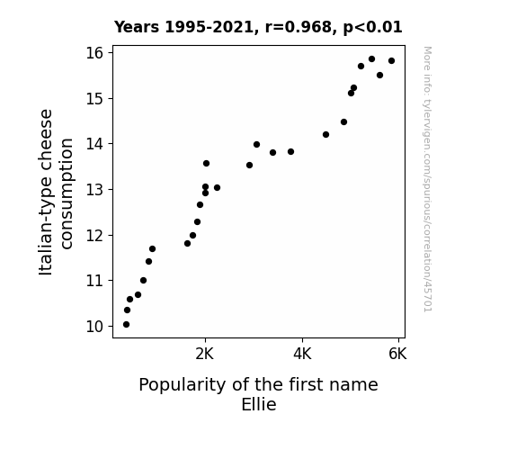 This means 93.7% of the change in the one variable (i.e., Popularity of the first name Ellie) is predictable based on the change in the other (i.e., Italian-type cheese consumption) over the 27 years from 1995 through 2021.