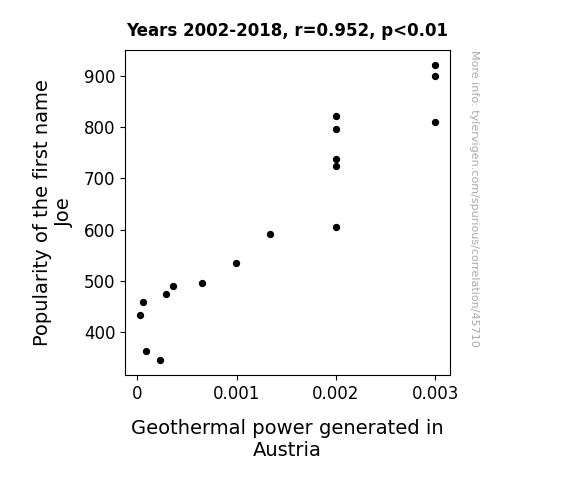 This means 90.6% of the change in the one variable (i.e., Geothermal power generated in Austria) is predictable based on the change in the other (i.e., Popularity of the first name Joe) over the 17 years from 2002 through 2018.
