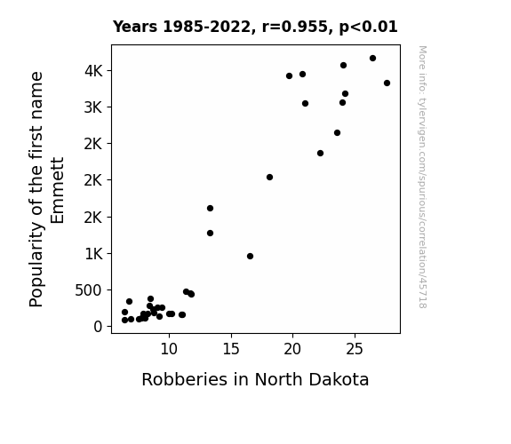 This means 91.3% of the change in the one variable (i.e., Robberies in North Dakota) is predictable based on the change in the other (i.e., Popularity of the first name Emmett) over the 38 years from 1985 through 2022.