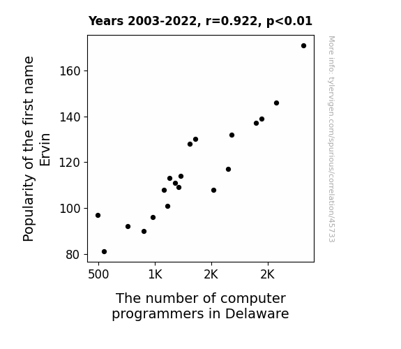 This means 85.1% of the change in the one variable (i.e., The number of computer programmers in Delaware) is predictable based on the change in the other (i.e., Popularity of the first name Ervin) over the 20 years from 2003 through 2022.