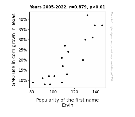 This means 77.2% of the change in the one variable (i.e., Popularity of the first name Ervin) is predictable based on the change in the other (i.e., GMO use in corn grown in Texas) over the 18 years from 2005 through 2022.