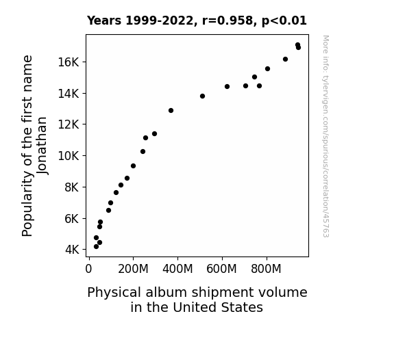 This means 91.8% of the change in the one variable (i.e., Physical album shipment volume in the United States) is predictable based on the change in the other (i.e., Popularity of the first name Jonathan) over the 24 years from 1999 through 2022.