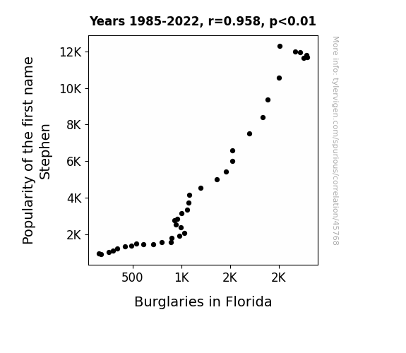This means 91.8% of the change in the one variable (i.e., Burglaries in Florida) is predictable based on the change in the other (i.e., Popularity of the first name Stephen) over the 38 years from 1985 through 2022.
