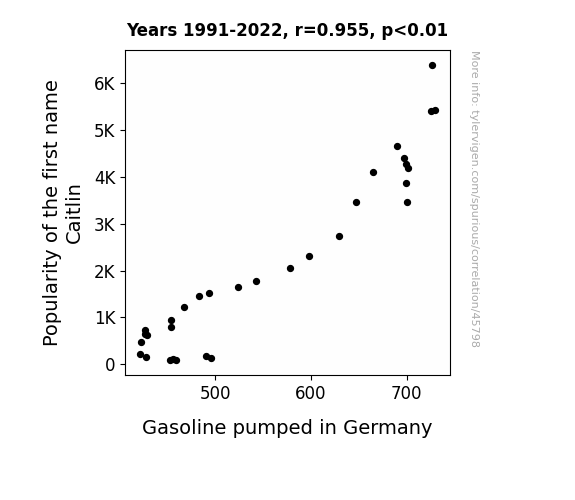 This means 91.1% of the change in the one variable (i.e., Gasoline pumped in Germany) is predictable based on the change in the other (i.e., Popularity of the first name Caitlin) over the 32 years from 1991 through 2022.