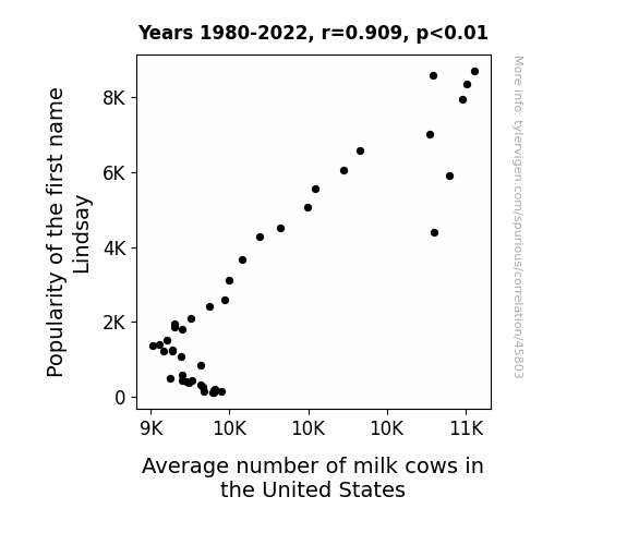 This means 82.7% of the change in the one variable (i.e., Average number of milk cows in the United States) is predictable based on the change in the other (i.e., Popularity of the first name Lindsay) over the 43 years from 1980 through 2022.
