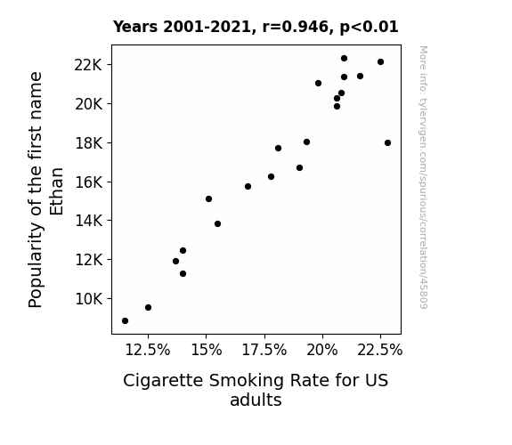 This means 89.6% of the change in the one variable (i.e., Cigarette Smoking Rate for US adults) is predictable based on the change in the other (i.e., Popularity of the first name Ethan) over the 21 years from 2001 through 2021.