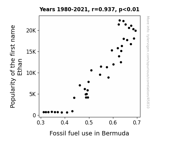 This means 87.8% of the change in the one variable (i.e., Fossil fuel use in Bermuda) is predictable based on the change in the other (i.e., Popularity of the first name Ethan) over the 42 years from 1980 through 2021.