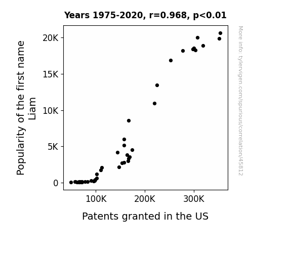 This means 93.6% of the change in the one variable (i.e., Patents granted in the US) is predictable based on the change in the other (i.e., Popularity of the first name Liam) over the 46 years from 1975 through 2020.