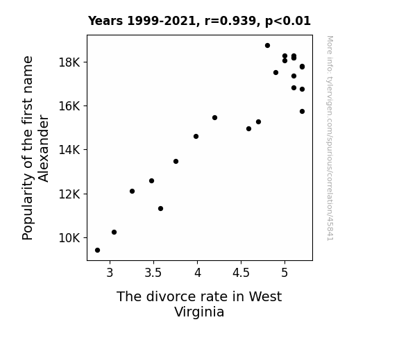 This means 88.2% of the change in the one variable (i.e., The divorce rate in West Virginia) is predictable based on the change in the other (i.e., Popularity of the first name Alexander) over the 23 years from 1999 through 2021.