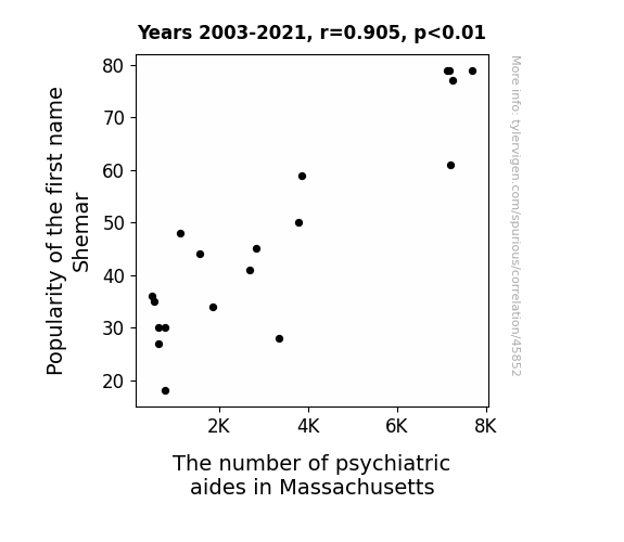 This means 82% of the change in the one variable (i.e., The number of psychiatric aides in Massachusetts) is predictable based on the change in the other (i.e., Popularity of the first name Shemar) over the 19 years from 2003 through 2021.