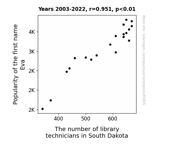 This means 90.4% of the change in the one variable (i.e., The number of library technicians in South Dakota) is predictable based on the change in the other (i.e., Popularity of the first name Eva) over the 20 years from 2003 through 2022.