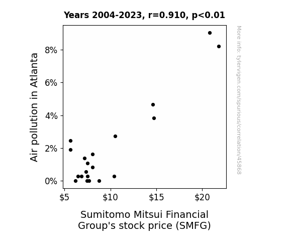 This means 82.9% of the change in the one variable (i.e., Sumitomo Mitsui Financial Group's stock price (SMFG)) is predictable based on the change in the other (i.e., Air pollution in Atlanta) over the 20 years from 2004 through 2023.