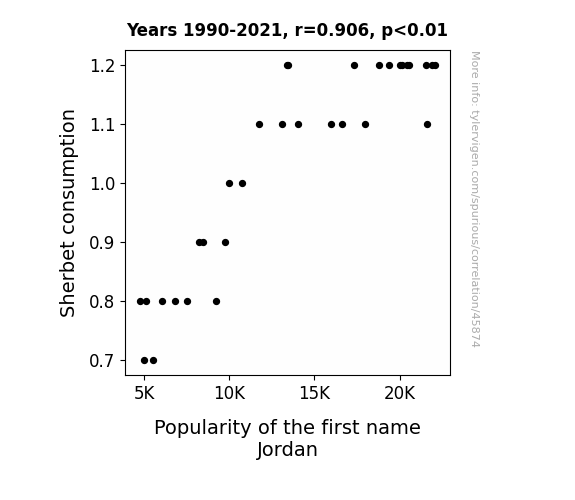 This means 82% of the change in the one variable (i.e., Popularity of the first name Jordan) is predictable based on the change in the other (i.e., Sherbet consumption) over the 32 years from 1990 through 2021.