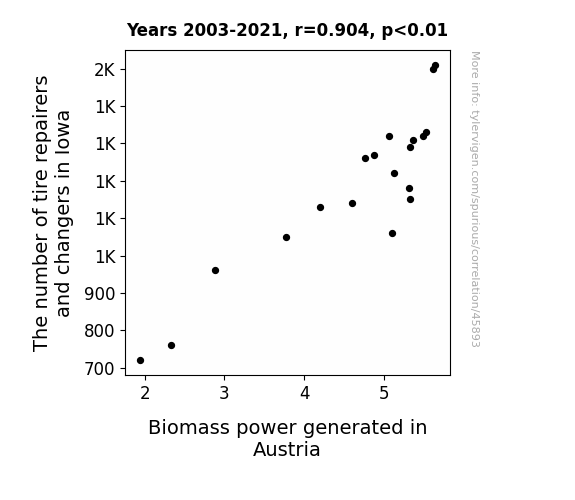 This means 81.7% of the change in the one variable (i.e., Biomass power generated in Austria) is predictable based on the change in the other (i.e., The number of tire repairers and changers in Iowa) over the 19 years from 2003 through 2021.