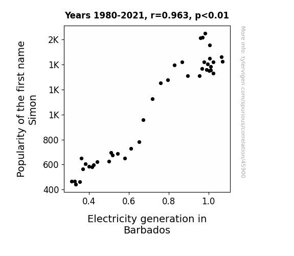 This means 92.8% of the change in the one variable (i.e., Electricity generation in Barbados) is predictable based on the change in the other (i.e., Popularity of the first name Simon) over the 42 years from 1980 through 2021.