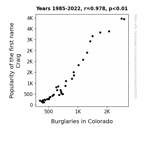 This means 95.7% of the change in the one variable (i.e., Burglaries in Colorado) is predictable based on the change in the other (i.e., Popularity of the first name Craig) over the 38 years from 1985 through 2022.