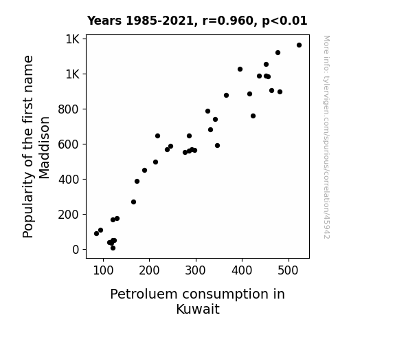 This means 92.2% of the change in the one variable (i.e., Petroluem consumption in Kuwait) is predictable based on the change in the other (i.e., Popularity of the first name Maddison) over the 37 years from 1985 through 2021.