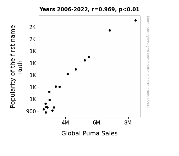 This means 93.9% of the change in the one variable (i.e., Global Puma Sales) is predictable based on the change in the other (i.e., Popularity of the first name Ruth) over the 17 years from 2006 through 2022.