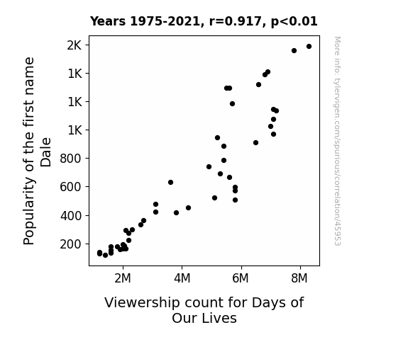 This means 84.1% of the change in the one variable (i.e., Viewership count for Days of Our Lives) is predictable based on the change in the other (i.e., Popularity of the first name Dale) over the 47 years from 1975 through 2021.