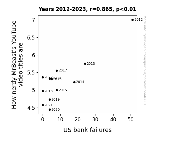 This means 74.9% of the change in the one variable (i.e., US bank failures) is predictable based on the change in the other (i.e., How nerdy MrBeast's YouTube video titles are) over the 12 years from 2012 through 2023.